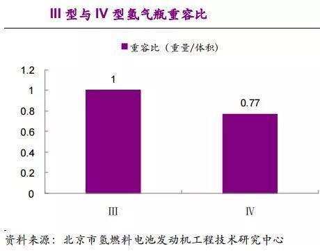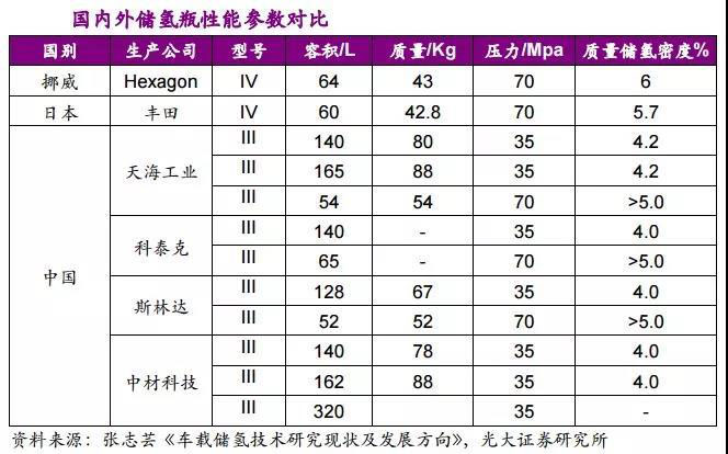 國(guó)內(nèi)企業(yè)采用III型(金屬內(nèi)膽纖維全纏繞氣瓶)儲(chǔ)氫密度為3.9%,而IV型(非金屬內(nèi)膽纖維全纏繞氣瓶)的儲(chǔ)氫密度可以達(dá)到5.5%。