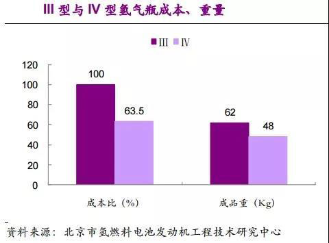 通過相同外徑、容積和壓力(70MPa)的III型與IV型氫氣瓶進(jìn)行比較可以清楚發(fā)現(xiàn),IV型具有低成本、小重容、輕量化的優(yōu)勢(shì)。
