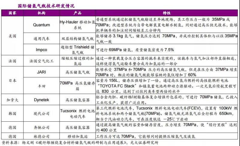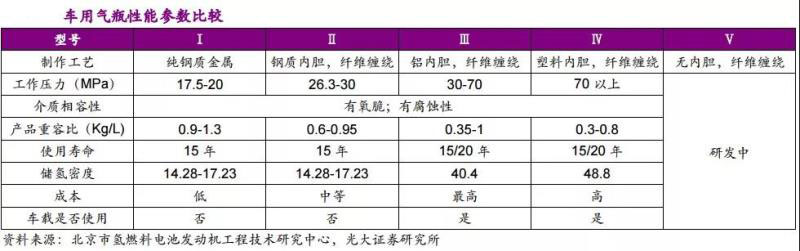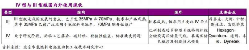 國(guó)外乘用車已經(jīng)開始使用質(zhì)量更輕、成本更低、質(zhì)量?jī)?chǔ)氫密度更高的IV型瓶,而中國(guó)IV型瓶還處于研發(fā)階段,成熟產(chǎn)品只有35MPa和70MPaIII型瓶,其中70MPaIII型瓶在乘用車樣車上應(yīng)用。