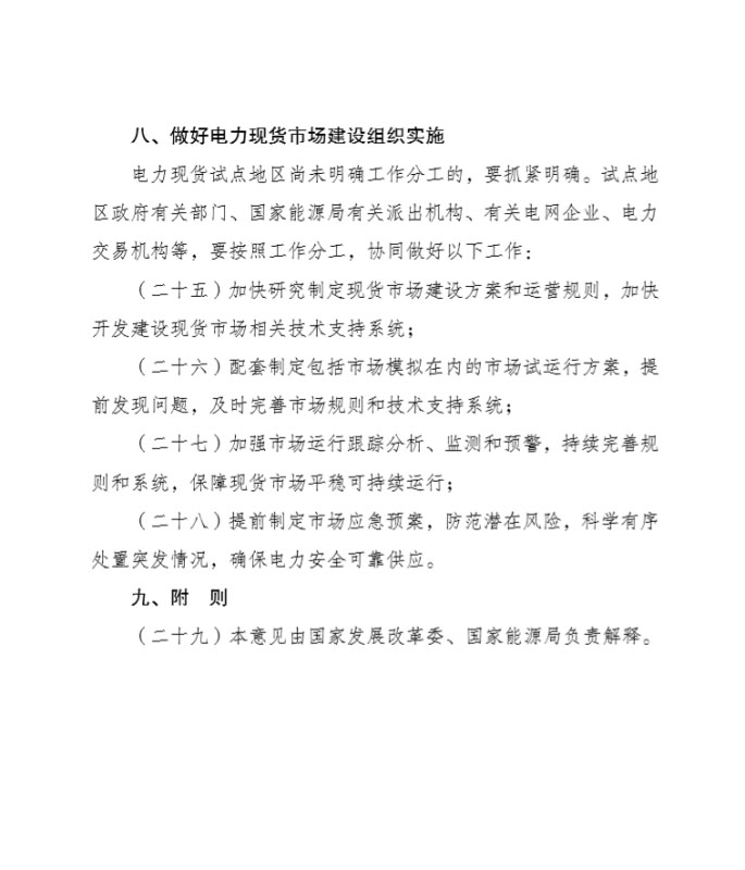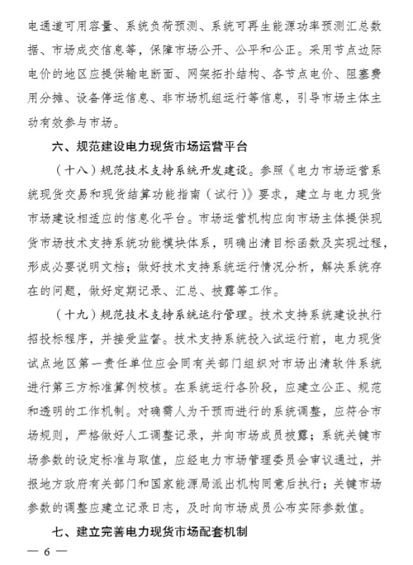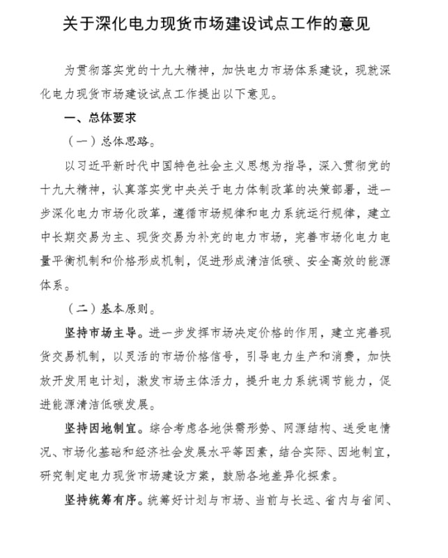 為貫徹落實(shí)黨的十九大精神,加快電力市場體系建設(shè),國家發(fā)展改革委、國家能源局組織編制了《關(guān)于深化電力現(xiàn)貨市場建設(shè)試點(diǎn)工作的意見》,現(xiàn)印發(fā)你們,請結(jié)合實(shí)際,推動(dòng)落實(shí)。如遇重大問題,請及時(shí)報(bào)告國家發(fā)展改革委、國家能源局。