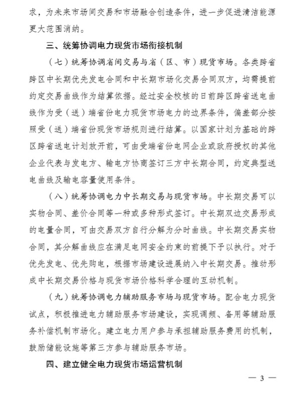 《意見》中強(qiáng)調(diào)了堅(jiān)持以市場為主導(dǎo),發(fā)揮市場對價(jià)格的決定作用,同時(shí)也強(qiáng)調(diào)根據(jù)實(shí)際情況因地制宜,鼓勵(lì)各地差異化的現(xiàn)貨市場建設(shè)方案。配合電力現(xiàn)貨試點(diǎn),積極推進(jìn)電力輔助服務(wù)市場建設(shè),實(shí)現(xiàn)調(diào)頻、備用等輔助服務(wù)補(bǔ)償機(jī)制市場化。建立電力用戶參與承擔(dān)輔助服務(wù)費(fèi)用的機(jī)制,鼓勵(lì)儲能設(shè)施等第三方參與輔助服務(wù)市場。以下為原文內(nèi)容: