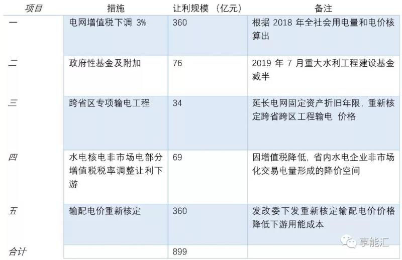 2019年一般工商業(yè)電價的下降空間,除政府性基金及附加、輸配電價重新核定外,還有來自電網(wǎng)增值稅、跨省跨區(qū)專項輸電工程、水電、核電(第三代機(jī)組)非市場電部分增值稅稅率調(diào)整等部分。粗略統(tǒng)計,電價全部下調(diào)10%后,電力企業(yè)讓利空間約達(dá)到899億元。