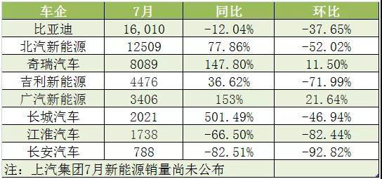 受大環(huán)境影響,新能源汽車生產(chǎn)企業(yè)7月銷量也環(huán)比大幅下降。高工電動(dòng)車統(tǒng)計(jì)的8家已經(jīng)披露了產(chǎn)銷快報(bào)的企業(yè)中,除廣汽新能源、奇瑞兩家企業(yè)6月基數(shù)較小外,其余環(huán)比均出現(xiàn)了較大幅度的下滑。