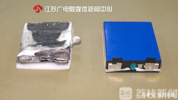 畫面中右側(cè)的藍(lán)色電池是用來做實(shí)驗(yàn)的3.2伏磷酸鐵鋰電池,大概相當(dāng)于一個(gè)電動(dòng)車用的電池單體的容量。左邊這一塊“白板”是經(jīng)過燃燒實(shí)驗(yàn)之后的狀態(tài),可以看到安全閥已經(jīng)打開,呈現(xiàn)出燒糊的狀態(tài)。