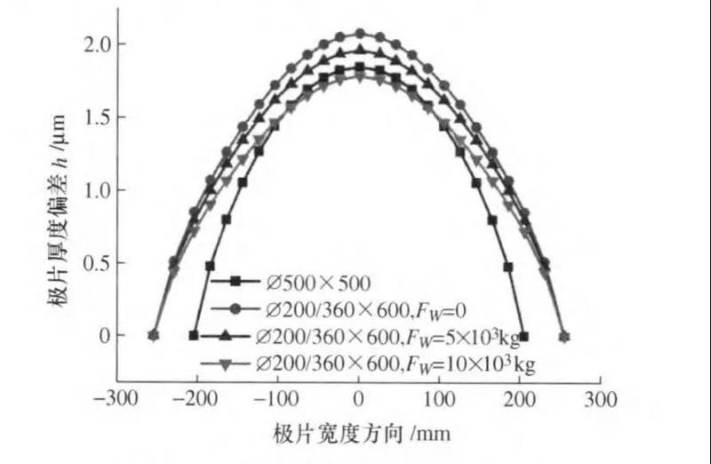彎輥力Fw由0增加為10000 kg時,最大極片厚度偏差減小0.3μm,極片沿寬度方向的厚度一致性有較小幅度改善。