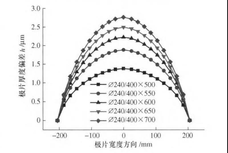 由于單位輥壓力的不均勻,導(dǎo)致極片沿寬度方向的壓下量不一致。若不考慮極片在輥壓后的反彈,可以認為極片的斷面形狀和工作輥有載輥縫的形狀相同。一定范圍內(nèi),軋輥撓曲變形越大,極片厚度一致性越差。