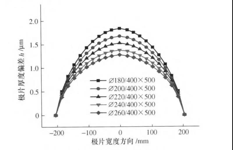 隨著工作輥直徑的增加,總體極片厚度偏差逐漸減小,沿極片寬度方向的中間位置厚度偏差減小較為明顯,而在極片兩側(cè)厚度偏差減少不明顯,如圖5。