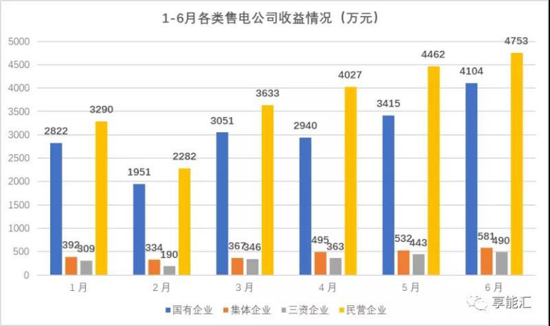 1-6月,電力用戶實際結(jié)算收益分成為86.9%,各月分成均在85%以上。上半年共有10家售電公司收益為負,整體虧損面為 7.8%,各類售電公司之間收益差異明顯。
