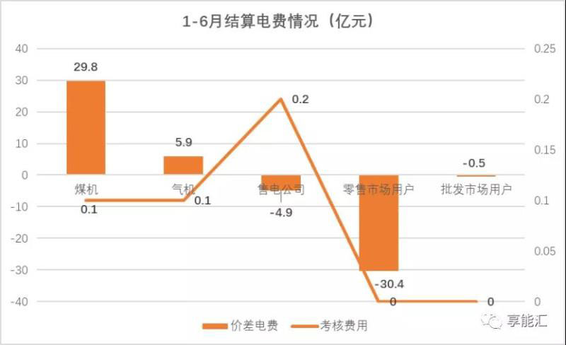 1-6月,供給側(cè)結(jié)算讓利35.9億元(其中價差電費35.7億元,考核費用0.1億元),按結(jié)算市場電量算平均價差-40.6厘/千瓦時,用戶(含批發(fā)市場用戶和零售市場用戶)凈收益30.8億元,按結(jié)算市場電量算平均價差-35.0厘/千瓦時,售電公司凈收益4.7億元(其中價差電費4.9億元,考核費用0.2億元),按結(jié)算市場電量算平均價差 -5.3厘/千瓦時。