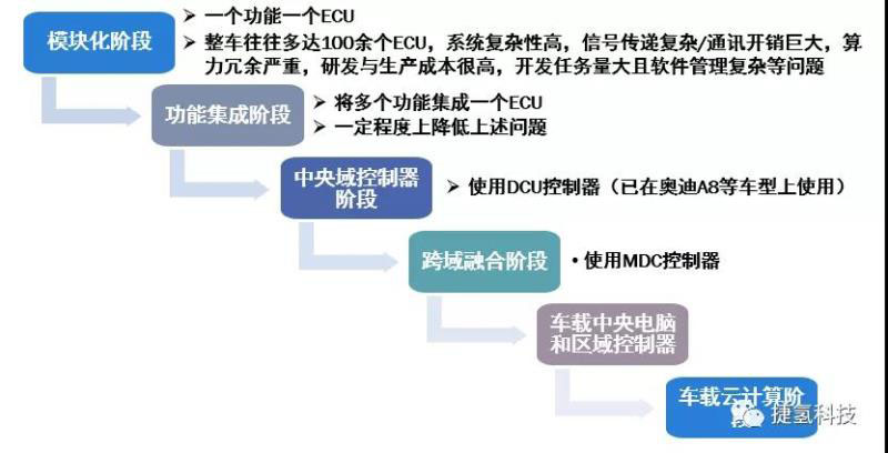 就像PC電腦,使用強(qiáng)大的CPU處理絕大多數(shù)運(yùn)算是成本與體積最優(yōu)化的方案,域控制器的思路就是使用一個(gè)強(qiáng)大的多核芯片完成域內(nèi)絕大部分運(yùn)算而取消眾多的其他控制器,這樣可以達(dá)到成本和體積的優(yōu)化,使得控制系統(tǒng)走向集成化,中心化(如下圖控制系統(tǒng)的演進(jìn)路線所示)。使用域控制器對(duì)燃料電池系統(tǒng)內(nèi)的控制器進(jìn)行集成設(shè)計(jì),可以提高軟硬件集成度,減小模塊數(shù)量,降低質(zhì)量風(fēng)險(xiǎn),減小系統(tǒng)體積重量,增強(qiáng)生產(chǎn)線柔性,并有效降低成本,是未來(lái)重要的發(fā)展趨勢(shì)。