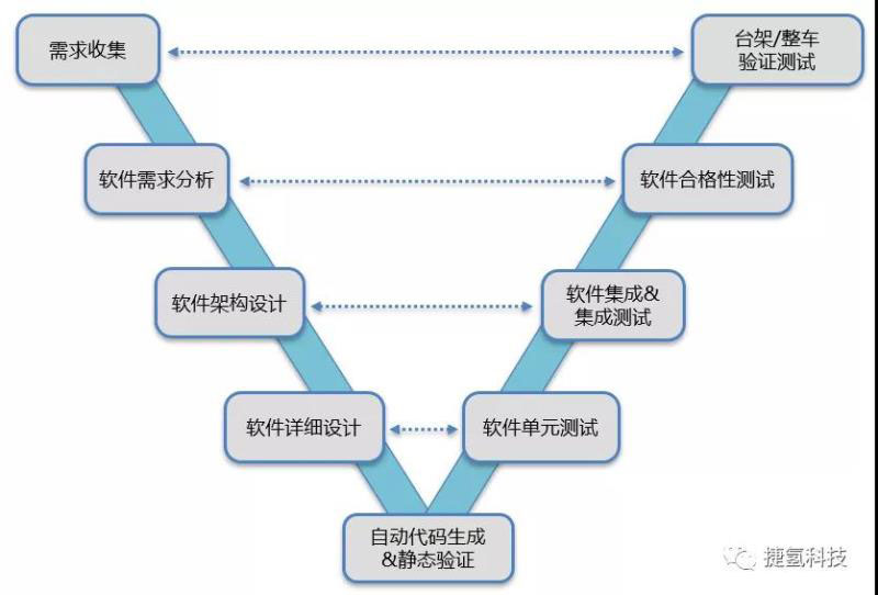 燃料電池軟件承擔(dān)如此之多的重要功能,其開發(fā)過(guò)程需要規(guī)范的開發(fā)流程與嚴(yán)格的測(cè)試流程。捷氫燃料電池系統(tǒng)的軟件開發(fā)采用基于模型開發(fā)(Model Based Design, MBD)的軟件開發(fā)方式,遵循V模式開發(fā)流程,同時(shí)使用ASPICE流程體系規(guī)定并約束軟件開發(fā)生命周期中的所有活動(dòng)。軟件的開發(fā)過(guò)程包括需求收集與分析,到軟件架構(gòu)設(shè)計(jì)與詳細(xì)開發(fā),最終自動(dòng)生成軟件代碼。而軟件開發(fā)的所有工作都對(duì)應(yīng)有多層次靜態(tài)驗(yàn)證、動(dòng)態(tài)測(cè)試或驗(yàn)證的方法,以保證軟件的功能和質(zhì)量。