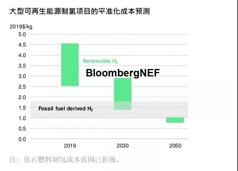 發(fā)展氫能經(jīng)濟離不開低成本、排放量小的大規(guī)模制氫方法。隨著可再生能源電力和電解槽的成本迅速下降,氫能經(jīng)濟距成為現(xiàn)實更進一步。BNEF預計,利用可再生能源大規(guī)模制氫的成本將從2019年的2.5-6.8美元/千克,降到2030年的1.4 - 2.9美元/ 千克;到2050年,成本進一步降至0.8 - 1.0美元/ 千克,甚至低于目前化石燃料制取氫(不含碳捕獲)1 - 1.8美元/ 千克的成本。氫氣的未來發(fā)展大有可期!