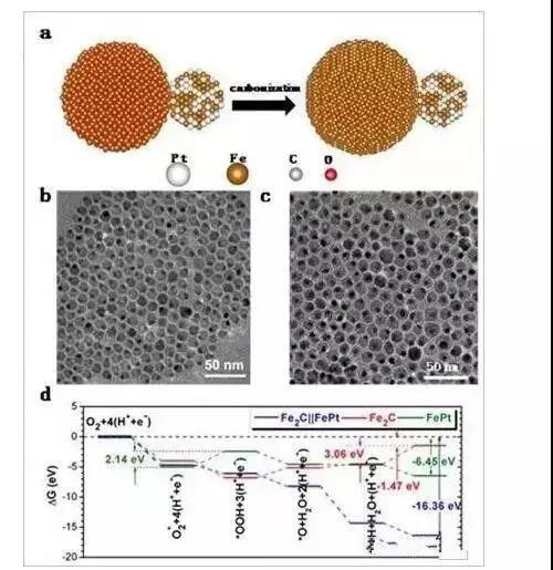 今年6月,北京大學工學院郭少軍團隊設計開發(fā)了一種新型啞鈴狀的PtFe-Fe2C納米粒子。這種啞鈴狀的PtFe-Fe2C納米粒子是通過碳化啞鈴狀的PtFe-Fe3O4納米粒子獲得(圖1a)。電化學測試表明,該催化劑在酸性介質中的氧還原的比活性和質量活性分別達到了3.53mAcm2和1.50Amg1,比商業(yè)Pt/C分別高出11.8和7.1倍,且具有極為優(yōu)異的電化學穩(wěn)定性,經歷5000個循環(huán)催化劑的活性幾乎沒有衰減。