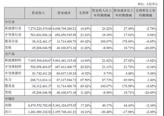 2019年上半年,新能源材料錄得營(yíng)收70.06億元,占營(yíng)收比重88.21%,同比增加21.62%,帶動(dòng)中環(huán)股份整體營(yíng)收同比大漲22.91%;電力錄得營(yíng)收2.69億元,同比大幅增長(zhǎng)87.73%。