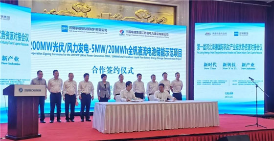 對(duì)接會(huì)上,在承德市委書記周仲明,承德市政府市長(zhǎng)常麗紅,河鋼集團(tuán)總經(jīng)理、黨委副書記彭兆豐,承德市政府常務(wù)副市長(zhǎng)李晉宇,河鋼集團(tuán)鋼研總院副院長(zhǎng)常金寶,河鋼集團(tuán)承鋼公司董事長(zhǎng)耿立唐、總經(jīng)理張振全,以及江西電建公司黨委書記、董事長(zhǎng)鄒勝萍,新能源研究院副院長(zhǎng)章文浦、綜合能源公司總經(jīng)理助理肖梟的共同見證下,我公司綜合能源公司總經(jīng)理李建明與河鋼集團(tuán)承鋼公司副總經(jīng)理柳朝陽(yáng)代表合作雙方,共同簽署了“200兆瓦光伏/風(fēng)力發(fā)電-5兆瓦/20兆瓦時(shí)全釩液流電池儲(chǔ)能示范項(xiàng)目合作備忘錄”。