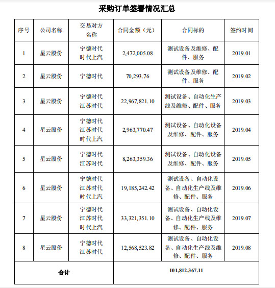 據(jù)悉,9月9日,福建星云電子股份有限公司(以下簡稱“公司”或“星云股份”)發(fā)布報(bào)告稱,公司于 2019 年 1 月 1 日與寧德時(shí)代新能源科技股份有限公司(以下簡稱“寧德時(shí)代”)簽訂了《框架采購合同》,合同生效日期2019 年 1 月 1 日至 2021 年 12 月 31 日。公司根據(jù)采購訂單內(nèi)容,向?qū)幍聲r(shí)代提供包括但不限于測試設(shè)備、自動(dòng)化 設(shè)備、自動(dòng)化生產(chǎn)線及維修、配件、服務(wù)。