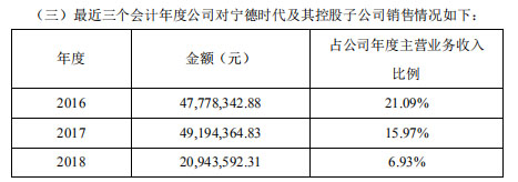 公告顯示,近三年來星云股份對寧德時(shí)代的銷售額占公司年度營收的比重分別為21.09%、15.97%、6.93%。