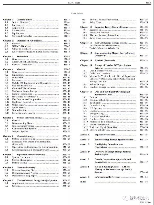 NFPA 855根據(jù)電力儲能系統(tǒng)采用的技術(shù),明確了儲能系統(tǒng)安裝、尺寸、隔離以及滅火和控制系統(tǒng)的要求。