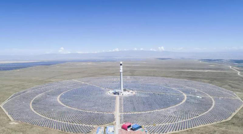 中電建青海共和50MW熔鹽塔式光熱發(fā)電項目為國家首批光熱發(fā)電示范項目之一,項目總占地面積2.12平方公里,采用近3萬面20平米定日鏡,吸熱器中心標(biāo)高210米,選用二元熔鹽作為傳儲熱介質(zhì),工作溫度290/565攝氏度,儲熱時長6小時,汽輪機選用超高壓、一次再熱、雙缸雙轉(zhuǎn)速、直接空冷凝汽式汽輪機,額定功率50MWe。
