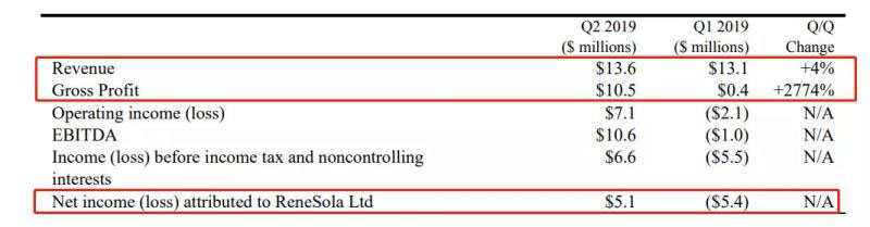 財報顯示,昱輝陽光第二季度開始恢復盈利,營收1360萬美元,毛利潤1050萬美元,凈收入為510萬美元,毛利率為77%,而2019年第一季度僅為2.8%,2018年第二季度為29.5%,也大大超出其55%至65%的指導范圍。