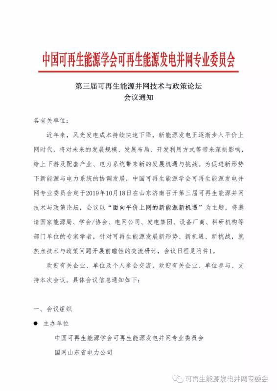 中國儲能網訊:中國可再生能源學會可再生能源發(fā)電并網專業(yè)委員會定于2019年10月18日在山東濟南召開第三屆可再生能源并網技術與政策論壇,會議主題為“面向平價上網的新能源新機遇”為主題,會議通知如下。