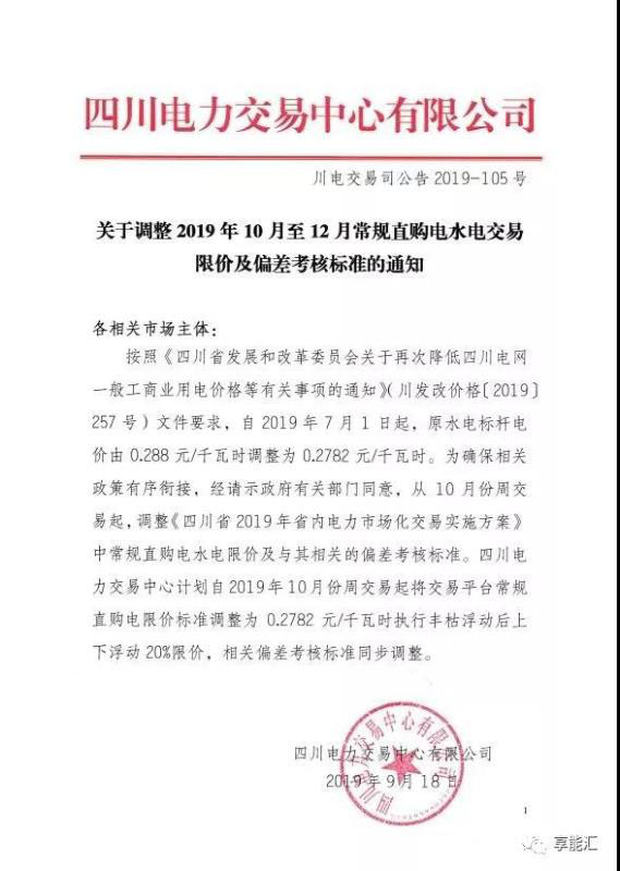 四川電力交易中心計劃自2019年10月份周交易起將交易平臺常規(guī)直購電限價標準調整為0.2782元/千瓦時,執(zhí)行豐枯浮動后上下浮動20%限價,相關偏差考核標準同步調整。