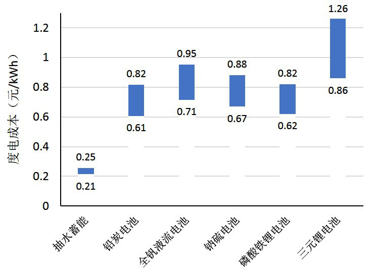 目前已商業(yè)化應(yīng)用的儲能技術(shù)有抽水蓄能、鉛蓄電池和磷酸鐵鋰電池。綜合調(diào)研數(shù)據(jù)獲知,目前抽水蓄能電站的投資成本為60~64億元/GW,抽水蓄能的系統(tǒng)能量成本為120~170萬元/(MW·h),未來隨著選址經(jīng)濟性的降低,系統(tǒng)成本會有一定程度上升。鉛蓄電池的系統(tǒng)能量成本在95~125萬元/(MW·h),受上游鉛價及環(huán)?;厥展芸貕毫Φ挠绊懀磥硐到y(tǒng)成本降低的空間很小。磷酸鐵鋰電池作為目前商業(yè)化應(yīng)用的綜合性能較高的典型儲能技術(shù),系統(tǒng)能量成本為150~230萬元/MWh,未來隨著低成本創(chuàng)新電池結(jié)構(gòu)和工藝的開發(fā),其成本還有繼續(xù)下降的空間。
