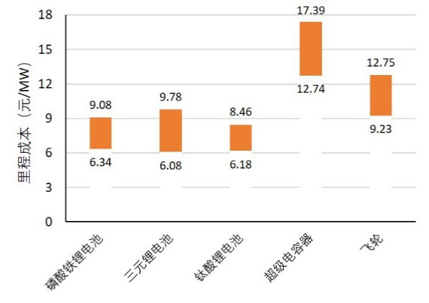 里程成本指在功率型調(diào)頻儲能電站的生命周期內(nèi),平均到單位調(diào)頻里程的電站投資成本,即儲能電站總投資/儲能電站總調(diào)頻里程。里程成本是評價儲能電站參與電網(wǎng)一次調(diào)頻或二次調(diào)頻經(jīng)濟性的重要指標。電網(wǎng)的一次調(diào)頻指機組調(diào)速器及負荷特性自發(fā)吸收電網(wǎng)高頻低幅負荷波動以減少頻率變化,時間尺度在秒級至分鐘級,火電機組通常的響應(yīng)時間在10~30s之間;二次調(diào)頻即AGC調(diào)頻,由機組跟隨AGC指令以平抑區(qū)域控制偏差,實現(xiàn)無差調(diào)節(jié)。由于受能量轉(zhuǎn)換機械過程的限制,火電機組提供二次調(diào)頻的響應(yīng)速度比一次調(diào)頻要慢,響應(yīng)時間一般需要1~2min。儲能設(shè)備與火電機組相結(jié)合共同提供調(diào)頻服務(wù),可以提高火電機組運行效率,減少機組磨損,提高機組對于電網(wǎng)AGC調(diào)頻指令的調(diào)節(jié)速率、響應(yīng)速度和響應(yīng)精度。根據(jù)調(diào)研及文獻數(shù)據(jù),給出不同儲能技術(shù)用于AGC輔助調(diào)頻時的里程成本范圍,如圖3所示。