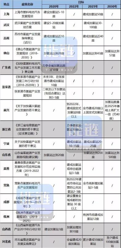 截至8月,全國(guó)已經(jīng)有上海、張家港、寧波、株洲、成都、河北等16個(gè)省市發(fā)布相關(guān)的氫能發(fā)展的規(guī)劃。在規(guī)劃中提到了到2020年、2022年、2025年、2030年加氫站的規(guī)劃數(shù)量目標(biāo)。詳見下表: