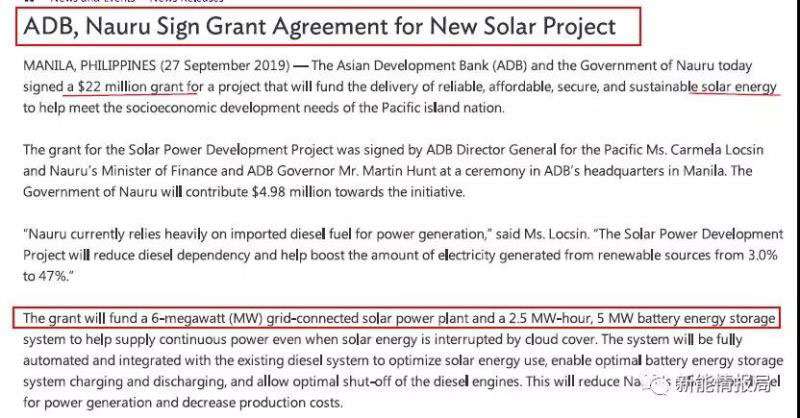 中國(guó)儲(chǔ)能網(wǎng)訊:根據(jù)亞洲開(kāi)發(fā)銀行(ADB)發(fā)布的消息,該行與瑙魯政府今天簽署了一個(gè)2200萬(wàn)美元的贈(zèng)款項(xiàng)目,將為這個(gè)太平洋島國(guó)提供可靠、安全、可持續(xù)以及可負(fù)擔(dān)的太陽(yáng)能,以幫助滿(mǎn)足其社會(huì)經(jīng)濟(jì)發(fā)展的需要。