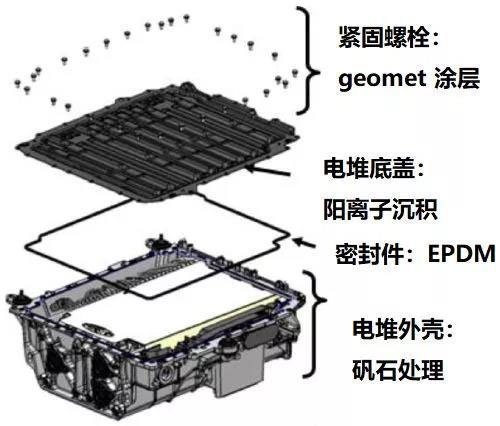 與傳統(tǒng)發(fā)動(dòng)機(jī)車輛相比,豐田Mirai燃料電池堆的安裝位置和工作溫度大不相同,具有不利的腐蝕環(huán)境。因底盤(pán)易遭受凍結(jié)、碎石和浸入,Mirai燃料電池堆需要良好的防銹措施。