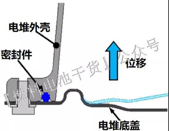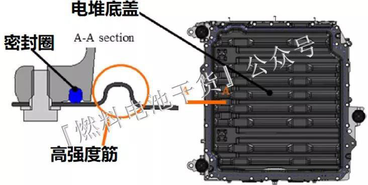 下圖表示Mirai燃料電池堆防水設(shè)計(jì)的底蓋結(jié)構(gòu)。底蓋置于電堆下表面,暴露在燃料電池堆所承受的最大壓力處。Mirai通過(guò)保證底蓋和堆外殼之間密封圈的接觸壓力來(lái)實(shí)現(xiàn)有效防水,并且底蓋上設(shè)置有外部筋,以在密封件和接觸部分間獲得必要的剛度來(lái)實(shí)現(xiàn)有效壓力。