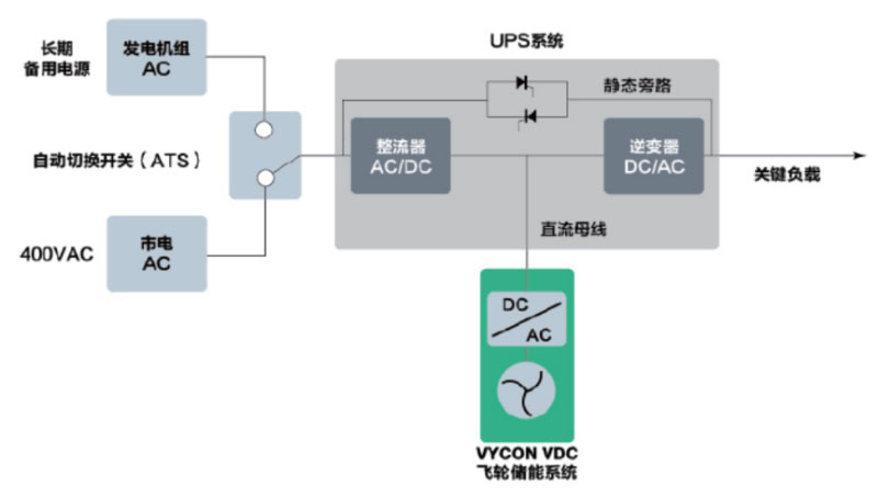 VYCON公司的VDC系列飛輪儲(chǔ)能設(shè)備利用飛輪高速旋轉(zhuǎn)的動(dòng)能來(lái)存儲(chǔ)能量并提供可靠的直流電源。飛輪儲(chǔ)能設(shè)備通過(guò)UPS的直流總線接入,其接入方式與傳統(tǒng)鉛酸蓄電池完全相同。充電時(shí),飛輪儲(chǔ)能設(shè)備從UPS接收充電電流,維持最高工作轉(zhuǎn)速;當(dāng)UPS輸入電源故障時(shí),飛輪儲(chǔ)能設(shè)備通過(guò)UPS逆變器快速放電,向負(fù)載提供不間斷電源保障。