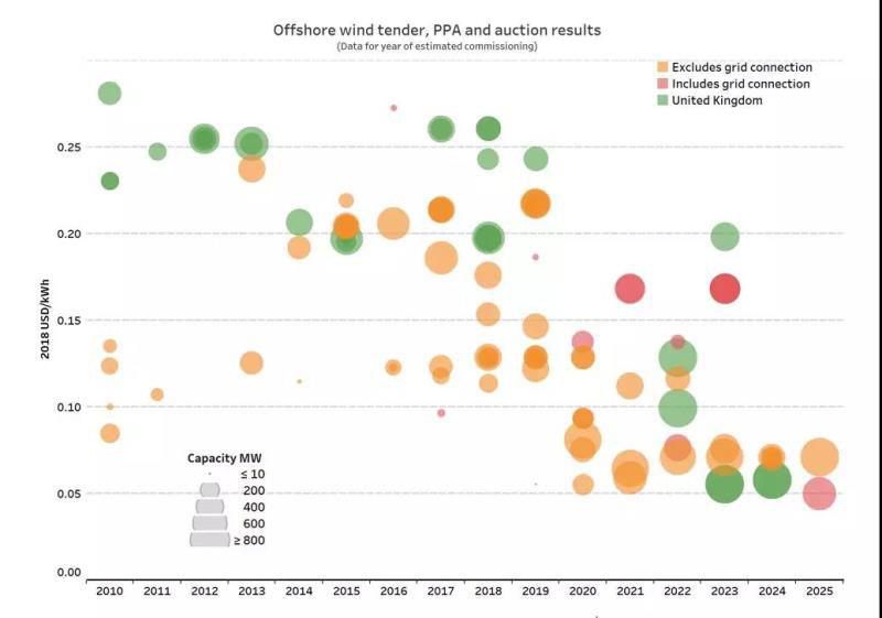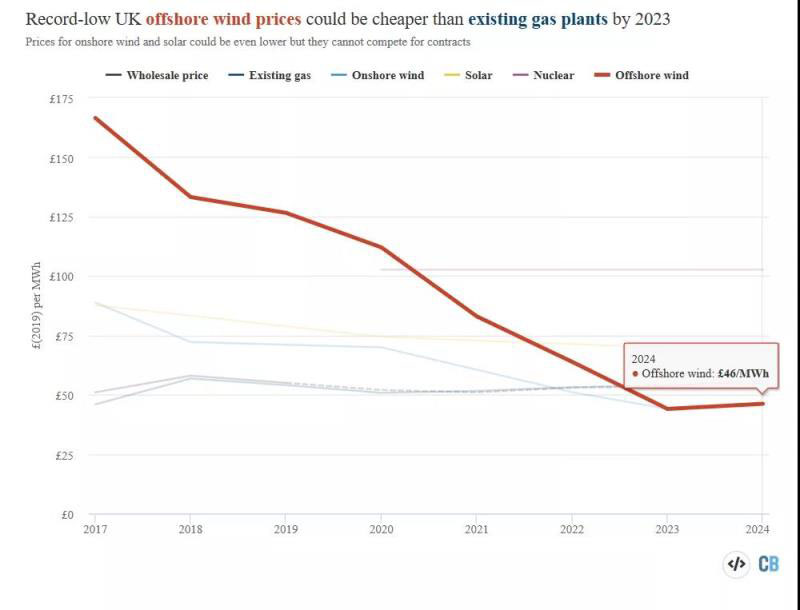 中國儲(chǔ)能網(wǎng)訊:2019年9月20日,英國6個(gè)海上風(fēng)電場(chǎng)(總計(jì)5.5GW)競(jìng)標(biāo)結(jié)果揭曉,報(bào)出創(chuàng)紀(jì)錄的低價(jià):2023/24年開始運(yùn)營的項(xiàng)目的價(jià)格為39.65英鎊/兆瓦時(shí)(按2012年價(jià)格,按通貨膨脹調(diào)整后為44英鎊/兆瓦時(shí)),而2024/25年的項(xiàng)目為41.61英鎊/兆瓦時(shí)。這些價(jià)格比政府的“參考價(jià)格”低8-9英鎊/兆瓦時(shí),意味著這些新的海上風(fēng)電場(chǎng)還將比現(xiàn)有的燃?xì)獍l(fā)電站更便宜地發(fā)電。預(yù)計(jì)這些海上風(fēng)電項(xiàng)目每年將生產(chǎn)約290億千瓦時(shí)(29TWh)的電力,相當(dāng)于英國2018年總發(fā)電量的9%,足以為英國2600萬戶家庭中的四分之一供電。按照英國的電力市場(chǎng)機(jī)制和市場(chǎng)趨勢(shì),這些風(fēng)電項(xiàng)目不但會(huì)收取任何補(bǔ)貼,反而會(huì)在2017年前向消費(fèi)者回饋近6億英鎊。