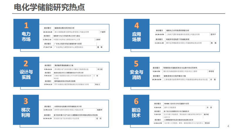 這次研討會(huì)研究的內(nèi)容,我們可以看到在主要重點(diǎn)在以下六個(gè)方面,包括電力市場(chǎng)的研究,儲(chǔ)能電池的設(shè)計(jì)與實(shí)踐,或是儲(chǔ)能電池的梯次利用、儲(chǔ)能的場(chǎng)景研究、儲(chǔ)能的本體安全、消防以及儲(chǔ)能的前沿技術(shù)??梢钥闯鰠⒓友杏憰?huì)的企業(yè)都想推動(dòng)儲(chǔ)能技術(shù)的不斷發(fā)展,使得更多儲(chǔ)能項(xiàng)目的落地,獲得更多的經(jīng)濟(jì)收益。
