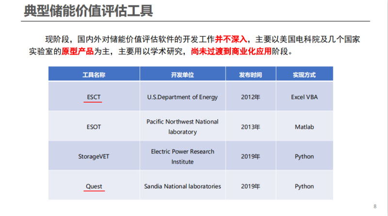 我們團(tuán)隊(duì)從2016年開始到現(xiàn)在,也做了一些儲(chǔ)能價(jià)值評(píng)估項(xiàng)目,在做這些項(xiàng)目的過程中,雖然我們考慮得比簡(jiǎn)單的Excel要多,但項(xiàng)目評(píng)估仍沒有形成整體的流程,也是沒有具體的軟件和優(yōu)化的過程,我們萌生了這個(gè)想法,想建立儲(chǔ)能價(jià)值的評(píng)估軟件,實(shí)現(xiàn)快捷、高效的評(píng)估計(jì)算,對(duì)項(xiàng)目有統(tǒng)一、整體的評(píng)估流程,我們希望有豐富的數(shù)據(jù)庫(kù),對(duì)儲(chǔ)能的壽命進(jìn)行準(zhǔn)確的評(píng)估。我們團(tuán)隊(duì)產(chǎn)生這個(gè)想法以后,我們最先做的工作是看看國(guó)內(nèi)外有沒有這方面成熟的價(jià)值評(píng)估軟件工具,想進(jìn)行一些學(xué)習(xí)和參考,國(guó)內(nèi)外對(duì)儲(chǔ)能評(píng)估的工具不那么深入,開發(fā)處于原型階段,以學(xué)術(shù)研究為主,主要的產(chǎn)品是美國(guó)的產(chǎn)品。我們對(duì)這些產(chǎn)品進(jìn)行學(xué)習(xí)、使用、研究,各個(gè)產(chǎn)品有各自的優(yōu)點(diǎn)和缺點(diǎn),最大的缺點(diǎn)是因?yàn)橹袊?guó)和美國(guó)電力市場(chǎng)的大環(huán)境和政策上的差異,他們的軟件完全不適用于國(guó)內(nèi)的計(jì)算,最后我們團(tuán)隊(duì)的想法是,自己進(jìn)行設(shè)計(jì)與開發(fā),適用于國(guó)內(nèi)環(huán)境政策的儲(chǔ)能價(jià)值評(píng)估軟件。
