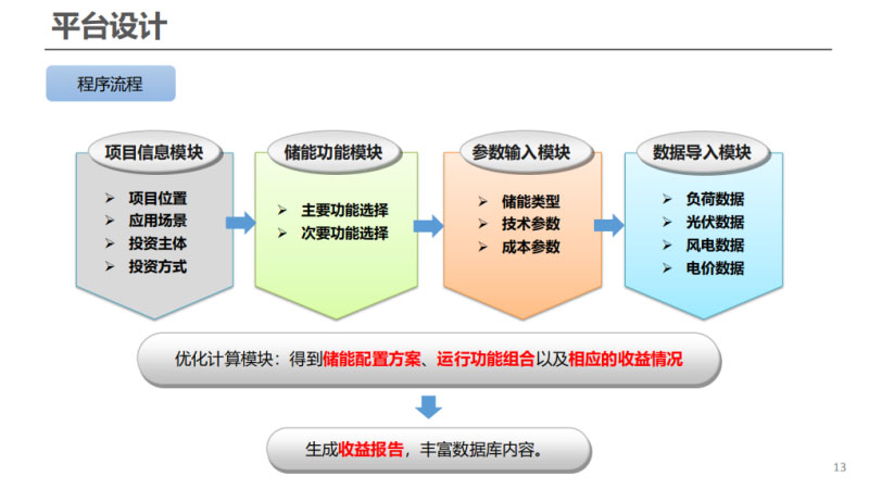 這是軟件的三大功能,儲(chǔ)能項(xiàng)目建設(shè)前有優(yōu)化配置的評(píng)估,得到儲(chǔ)能容量和配置方案,我們對(duì)工況進(jìn)行仿真計(jì)算,我們可以計(jì)算出儲(chǔ)能的損耗。運(yùn)行優(yōu)化是立足于已經(jīng)建立的儲(chǔ)能項(xiàng)目,我們想讓儲(chǔ)能項(xiàng)目實(shí)現(xiàn)多功能的綜合利用,通過功能組合的優(yōu)化,實(shí)現(xiàn)對(duì)不同的儲(chǔ)能功能進(jìn)行優(yōu)化,得到組合的最優(yōu)方案,最終使得儲(chǔ)能利益最大化。通過靈敏度分析,我們對(duì)未來預(yù)期,儲(chǔ)能項(xiàng)目影響進(jìn)行分析,儲(chǔ)能成本的變化、儲(chǔ)能類型的變化、經(jīng)濟(jì)利率條件對(duì)我們項(xiàng)目的影響、對(duì)方案收益的影響。這是我們程序的整體流程,主要包括信息的輸入模塊,通過優(yōu)化計(jì)算得到儲(chǔ)能的配置方案、運(yùn)行功能組合和收益情況,最終能夠提供收益報(bào)告分析。