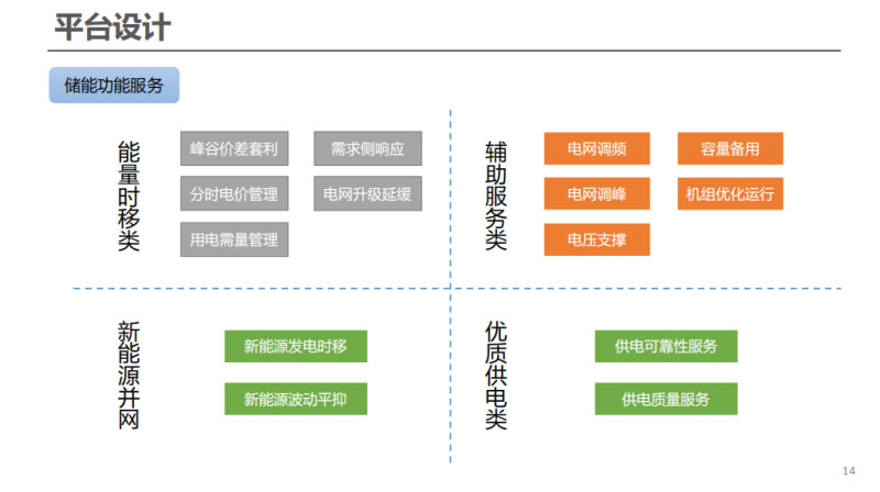 我們的軟件平臺(tái)支持靈敏度的分析,能夠分析未來的政策前景和儲(chǔ)能的價(jià)格對(duì)項(xiàng)目的影響,儲(chǔ)能價(jià)格降低以后對(duì)收益的影響、政策鼓勵(lì)對(duì)收益的影響。上午有專家提到儲(chǔ)能應(yīng)用的場(chǎng)景一般是電網(wǎng)側(cè)、輸電和用戶側(cè),我們對(duì)這些功能場(chǎng)景進(jìn)行一些建模,總共有14種。