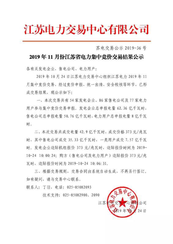 中國儲能網(wǎng)訊:江蘇電力交易中心于2019年10月24日發(fā)布了關于11月份江蘇省電力集中競價交易結果公示。