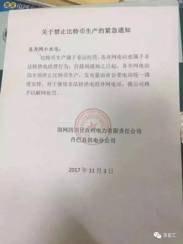 互聯(lián)網(wǎng)上流傳著一張2017年11月3日,落款為國網(wǎng)四川甘孜州電力有限責(zé)任公司丹巴縣供電分公司下發(fā)的《關(guān)于禁止比特幣生產(chǎn)的緊急通知》的文件,該文件要求各并網(wǎng)電站停止比特幣生產(chǎn),電量由變電站統(tǒng)一調(diào)度。這份文件隨后由國家電網(wǎng)四川省電力公司證實是丹巴縣供電分公司下發(fā)的通知,原因是當(dāng)?shù)剡M(jìn)入枯水期后,發(fā)電量已經(jīng)無法滿足民生需求,而有部分中小電站并沒有供電資質(zhì),卻還在給礦場發(fā)電,才緊急發(fā)布的這一通知。