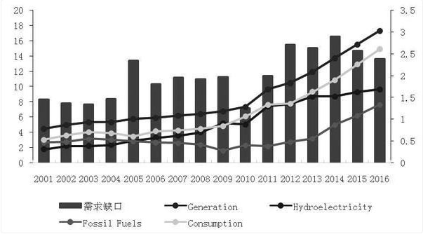 根據EIA數據,2016年緬甸共發(fā)電173億度,同比增加17%,其中水力發(fā)電96億度,化石能源發(fā)電76億度。與老撾的發(fā)電結構相似,水力與化石能源是緬甸的主要發(fā)電方式。從緬甸電力供需結構圖中可以看出,2000年以來緬甸發(fā)電規(guī)模持續(xù)擴大,2010年后增速上移,主要是受到化石能源發(fā)電容量增加影響。