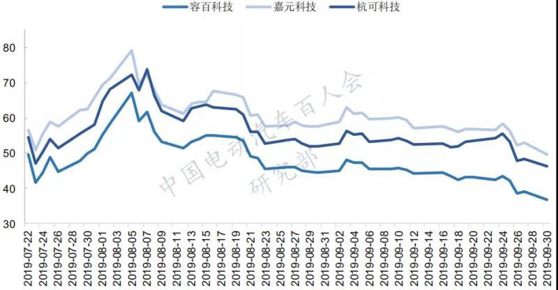 科創(chuàng)板首發(fā)市盈率更高,上市表現(xiàn)趨于穩(wěn)定??苿?chuàng)板上市企業(yè)的首發(fā)市盈率更高(見圖表7),容百科技首發(fā)市盈率超過了58倍,遠遠突破創(chuàng)業(yè)板或主板的23倍;同時榮百科技、杭可科技、嘉元科技作為首批科創(chuàng)板上市企業(yè),首發(fā)迄今日均換手率高于20%,充分說明科創(chuàng)板一方面給予了企業(yè)更高的市場預(yù)期,另一方面也增加了二級市場的博弈;從股價來看(見圖表8),科創(chuàng)板上市首批企業(yè)榮百科技、杭可科技、嘉元科技首發(fā)迄今漲幅已經(jīng)回落,未來市場趨于理性。