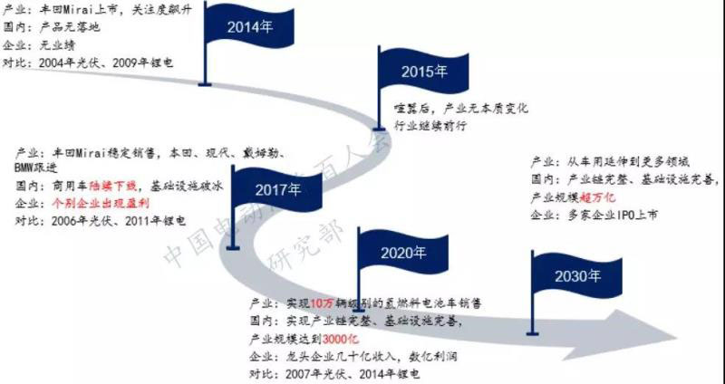2)2017年,隨著豐田mirai燃料電池汽車的穩(wěn)定銷售,本田、現(xiàn)代、戴姆勒和寶馬等車企紛紛跟進。國內(nèi)也有部分燃料電池商用車下線,個別企業(yè)開始出現(xiàn)盈利,此時相當(dāng)于2006年的光伏和2011年的鋰電階段;