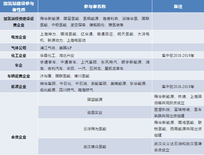 隨著近年氫能行業(yè)發(fā)展逐漸加快,加氫站建設(shè)參與主體逐漸增多,涉及到氫能產(chǎn)業(yè)各環(huán)節(jié),包括上游的能源、化工和氣體公司以及專業(yè)的加氫站建設(shè)運(yùn)營(yíng)商和設(shè)備供應(yīng)商,中游的燃料電池電堆和系統(tǒng)廠商,下游的整車(chē)廠商和車(chē)輛運(yùn)營(yíng)企業(yè),呈現(xiàn)多方合資合作、共同建設(shè)運(yùn)營(yíng)的局面。