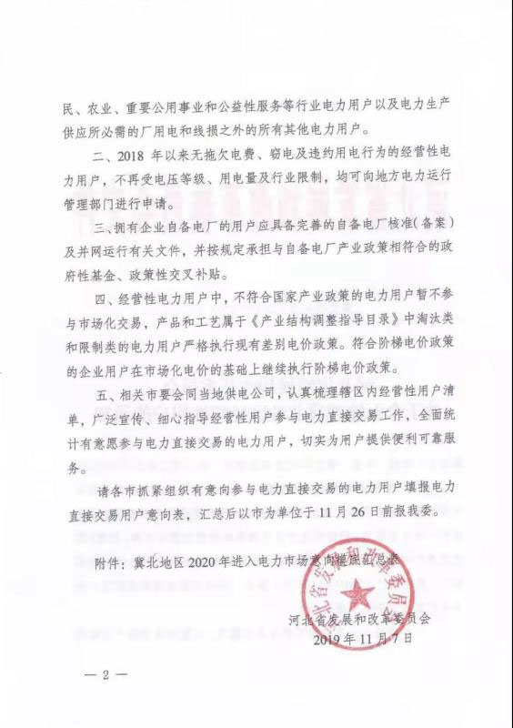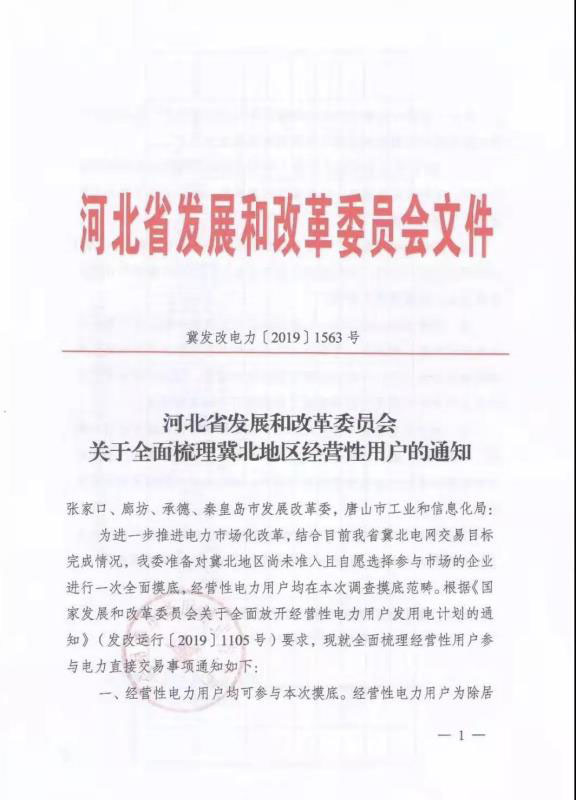 11月7日河北發(fā)改委下發(fā)文件稱全面梳理冀北地區(qū)經(jīng)營(yíng)性電力用戶,對(duì)冀北地區(qū)尚未準(zhǔn)入且自愿參加市場(chǎng)的企業(yè)進(jìn)行全面摸底。經(jīng)營(yíng)性電力用戶不再受電壓等級(jí)、用電量及行業(yè)限制,均可向地方電力運(yùn)行管理部門進(jìn)行申請(qǐng)。這意味著冀北也即將全面放開經(jīng)營(yíng)性電力用戶參與電力市場(chǎng)化交易。