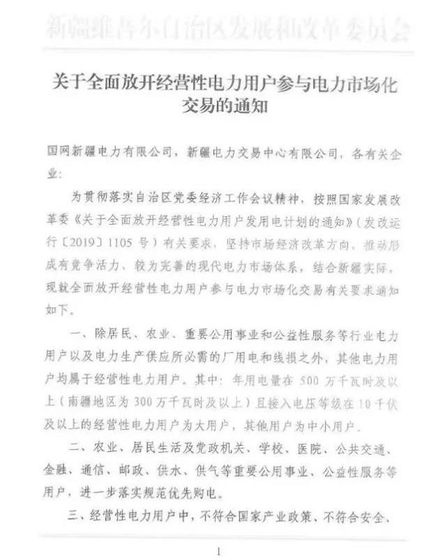 11月3日新疆自治區(qū)發(fā)改委發(fā)布了《關(guān)于全面放開經(jīng)營(yíng)性電力用戶參與電力市場(chǎng)化交易的通知》,稱除居民、農(nóng)業(yè)、重要公用事業(yè)和公益性服務(wù)等行業(yè)電力用戶以及電力生產(chǎn)供應(yīng)所必需的廠用電和線損之外,其他電力均屬于經(jīng)營(yíng)性電力用戶。其中:年用電量在500萬(wàn)千瓦時(shí)及以上(南疆地區(qū)為300萬(wàn)千瓦時(shí)及以上)且接入電壓等級(jí)在10千伏及以上的經(jīng)營(yíng)性電力用戶為大用戶,其他用戶為中小用戶。中小用戶可通過(guò)售電公司代理后參加電力市場(chǎng)化交易。