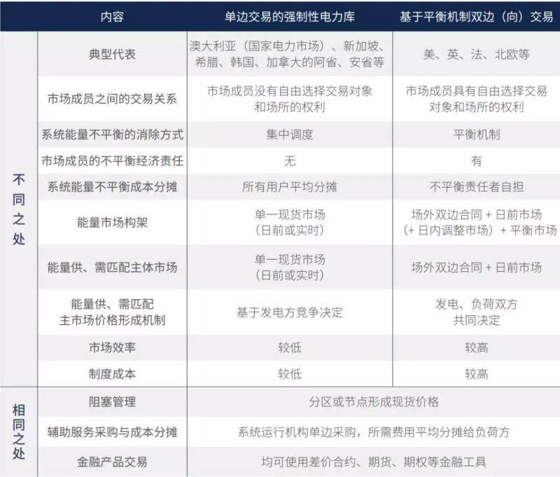在“強(qiáng)制電力庫” 中,只有市場組織者一個(gè)買者,發(fā)電方不能與負(fù)荷方直接交易,所有發(fā)電商都只能將電賣給系統(tǒng)運(yùn)營機(jī)構(gòu),所有經(jīng)銷商和批發(fā)購電的大用戶也只能向系統(tǒng)運(yùn)營機(jī)構(gòu)買電,因而強(qiáng)制電力庫也被稱為單邊(向)交易的電力批發(fā)市場。而“雙邊(向)交易” 的批發(fā)市場中有多個(gè)買者,且買、賣雙方可自由選擇交易的對象和場所。但這種自由的電力批發(fā)交易也是有代價(jià)的,即未按合同發(fā)、用電者,須為由此造成的系統(tǒng)不平衡承擔(dān)經(jīng)濟(jì)責(zé)任。因此,平衡機(jī)制也被認(rèn)為是“雙邊(向)交易” 的基石或核心。所以,盡管各國電力批發(fā)市場構(gòu)建的實(shí)踐千差萬別,但本質(zhì)上都是在單邊交易的“強(qiáng)制電力庫(單邊交易) ” 和基于平衡機(jī)制的“雙邊(向)交易” 之間進(jìn)行選擇。在澳大利亞、新加坡、加拿大的阿爾伯塔省等國家和地區(qū),現(xiàn)行的交易模式都是單邊交易的“強(qiáng)制性電力庫” ,在英國、德國、法國、美國已市場化改革的各州及北歐等國家和地區(qū),現(xiàn)行的交易模式均為基于平衡機(jī)制的“雙邊(向)交易” 。