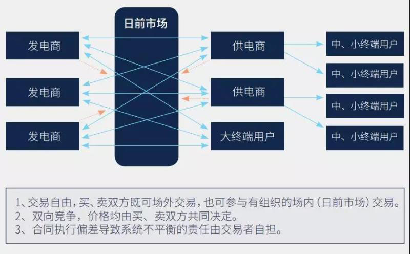 反之,如果發(fā)電方與負(fù)荷方的交易關(guān)系是“雙邊(向) ” 的,該市場的構(gòu)架就要復(fù)雜很多。一是場外的雙邊合同交易必不可少;二是要有自愿參加、雙向交易的“日前市場” , 市場成員的自由選擇權(quán)才能完整體現(xiàn);三是必須有平衡市場。因?yàn)樨?fù)荷突然變化、輸電阻塞、發(fā)電故障等意外情況總會(huì)發(fā)生,由此而導(dǎo)致交易合同不能完全執(zhí)行、進(jìn)而引發(fā)系統(tǒng)能量不平衡的情況在所難免,這就必須有“平衡機(jī)制” 設(shè)計(jì),從而“平衡市場” 也必不可少。所以,雙邊(向)交易的市場構(gòu)架,通常由互為條件、相輔相成的三大部分組成:場外雙邊合同 + 日前市場 +(實(shí)時(shí))平衡市場。場外雙邊合同與日前市場共同構(gòu)成能量交易的主體市場。(實(shí)時(shí))平衡市場是不平衡電量交易的市場,用于彌補(bǔ)雙邊(向)交易的合同執(zhí)行偏差、并確定不平衡責(zé)任者應(yīng)付費(fèi)用,是平衡機(jī)制的市場化執(zhí)行方式。