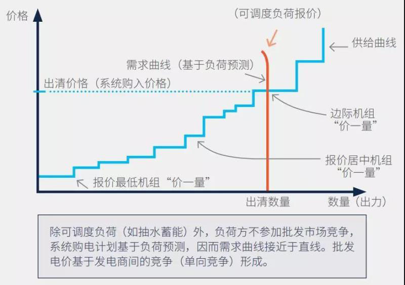 能量現(xiàn)貨市場的出清機(jī)制。所謂能量現(xiàn)貨市場,是指分時(shí)段的電能量(標(biāo)準(zhǔn)化了的電力產(chǎn)品)集中交易,通常在不晚于交付日的前一日開市。如前所述,日間不同時(shí)段的電力供給,其效用和成本均大不相同。因此,一個(gè)發(fā)育成熟的電力市場必須有不晚于日前安排的電力分時(shí)交易,才能完整地反映電力供求關(guān)系的形成特點(diǎn),進(jìn)而有效率地配置電力資源。但在不同的交易關(guān)系中,能量現(xiàn)貨市場的出清機(jī)制則大不相同:“單邊(向)交易” 的現(xiàn)貨市場買方單一,市場出清機(jī)制自然也是單向的,即由市場組織者基于發(fā)電商的單向競爭決定;而“雙邊(向)交易” 的現(xiàn)貨市場(日前市場)中,既有發(fā)電方賣電也有負(fù)荷方買電,且交易者可自由進(jìn)出。因此,其成交的數(shù)量和價(jià)格,也必然同場外中長期合同交易一樣,由發(fā)電方與負(fù)荷方的雙向競爭決定。