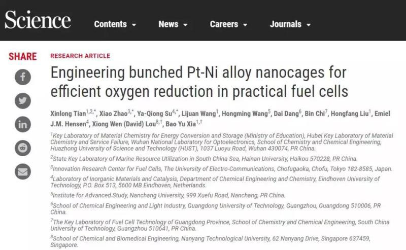2019年11月15日,國際頂級學(xué)術(shù)期刊《Science》以研究長文形式刊發(fā)華中科技大學(xué)化學(xué)與化工學(xué)院夏寶玉教授團隊的最新研究成果《Engineering bunched Pt-Ni alloy nanocages for efficient oxygen reduction in practical fuel cells》。該文闡述了夏寶玉教授團隊在高效長壽命鉑合金催化劑的最新研究進展:采用(電)化學(xué)腐蝕方法對鉑基催化劑的近表面結(jié)構(gòu)和組分進行調(diào)控,大幅提升高效鉑鎳合金催化劑在實際燃料電池器件中的耐久性,有望成為發(fā)展燃料電池行之有效的關(guān)鍵手段。